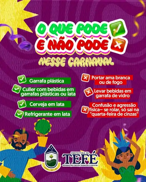 Para garantir que o Carnaval em Tefé seja seguro e divertido, a Prefeitura traz orientações sobre o que é permitido e o que deve ser evitado durante a folia: