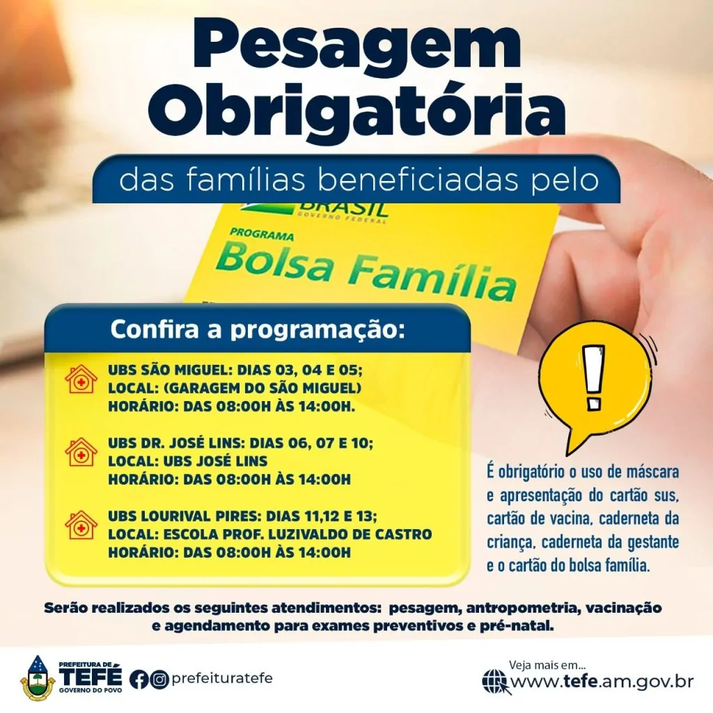 A prefeitura de Tefé, através da Secretaria de Saúde, informa aos beneficiários do Bolsa Família que durante todo o mês…
