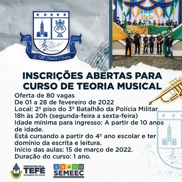 A Escola Municipal de Música Santa Cecília, vinculada à Prefeitura de Tefé por meio da Secretaria Municipal de Educação, Esporte e Cultura (SEMEEC), estará com inscrições abertas para ingresso no Curso de Teoria Musical, do dia 01 ao dia 28 de fevereiro de 2022.