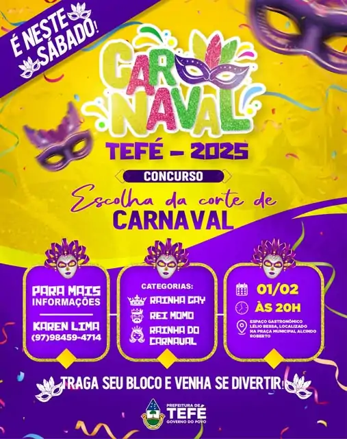 A Prefeitura de Tefé convida todos a prestigiar os candidatos e a celebrar o início oficial da temporada carnavalesca no município.