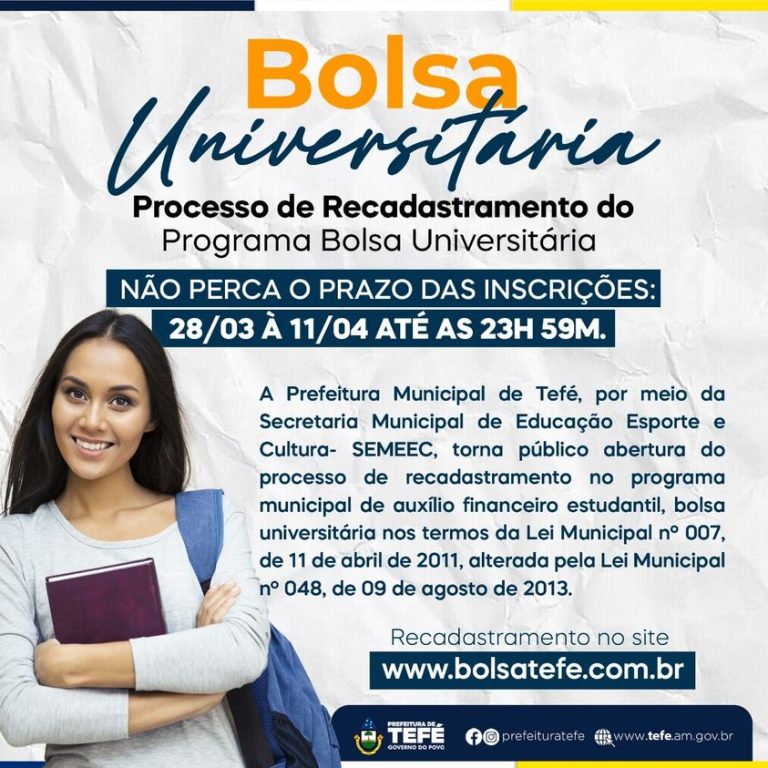 O Programa Municipal de Auxílio Financeiro Estudantil (PMAFE), da prefeitura de Tefé, é um importante auxílio destinado a estudantes universitários que cursam uma faculdade fora da cidade, por isso, periodicamente a prefeitura de Tefé atualiza o banco de dados dos estudantes cadastrados e habilitados para receberem o auxílio. Esse ano, o recadastramento que é obrigatório, estará aberto de 28 de março a 11 de abril.