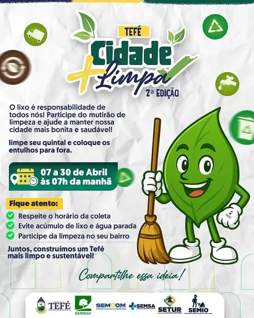 As datas específicas para cada bairro serão divulgadas nas redes sociais da Prefeitura e nos principais meios de comunicação. A Prefeitura reforça o convite à população para participar ativamente, contribuindo para uma Tefé mais limpa, saudável e acolhedora.