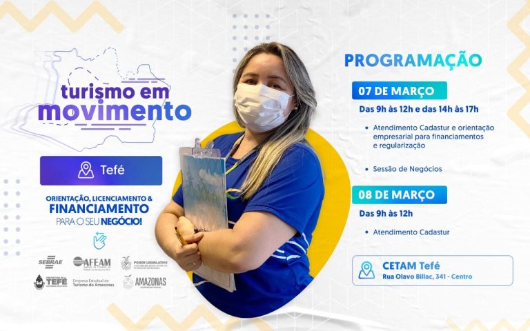 Em parceria com o Sebrae-AM, a AFEAM, a Comissão de Turismo da ALEAM e a Prefeitura de Tefé, a Amazonastur realizará, nos próximos dias 07 e 08 de março, uma série de ações de orientação empresarial para financiamentos e regularização, além da Sessão de Negócios com empresários de turismo de Manaus e reunião com o trade turístico.