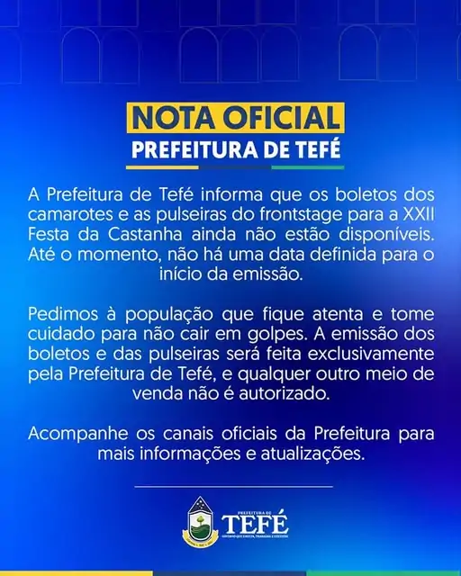 A Prefeitura de Tefé alerta que os boletos dos camarotes e as pulseiras do frontstage para a XXII Festa da Castanha ainda não estão disponíveis. Até o momento, a administração municipal não divulgou a data de início da emissão.