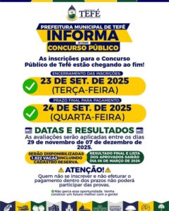 📢 Atenção, candidatos! As inscrições para o Concurso Público 001/2025 da Prefeitura de Tefé estão prestes a encerrar. Ao todo, estão sendo oferta...