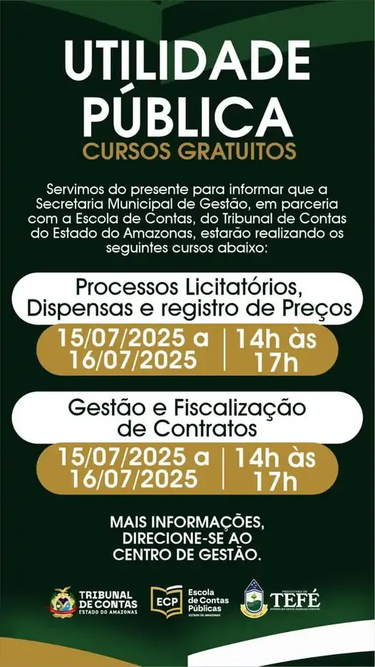 A Prefeitura de Tefé, por meio da Secretaria Municipal de Gestão, em parceria com a Escola de Contas do Tribunal de Contas do Estado do Amazonas, vai promover cursos gratuitos voltados à qualificação profissional na área de gestão pública.