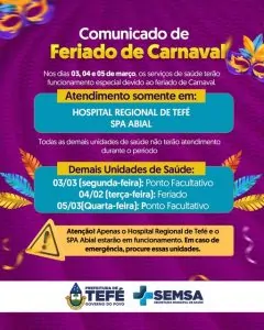 A Prefeitura de Tefé convida a população e visitantes a acompanharem as redes sociais oficiais para conferir a programação completa e não perder nenhum detalhe da folia.