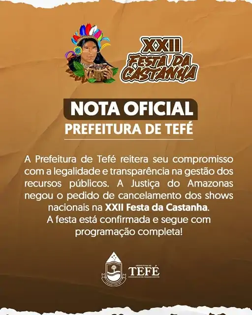 A Prefeitura de Tefé informa que foi notificada sobre a decisão do Juízo da 2ª Vara da Comarca de Tefé, referente à Ação Civil Pública n.º 0002377-86.2025.8.04.7500, movida pelo Ministério Público do Estado do Amazonas, que solicitava a suspensão dos shows de artistas nacionais contratados para a XXII Festa da Castanha.