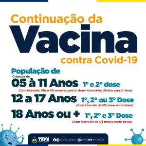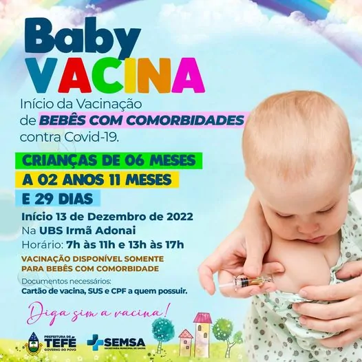 A Prefeitura de Tefé recebeu a primeira remessa da vacina contra a Covid-19 Pfizer Baby, destinada a crianças de seis meses a dois anos de idade com comorbidades. A vacinação deste público terá início na terça-feira (13). Pais ou responsáveis devem levá-las para se vacinar tendo em mãos o Cartão vacinal, SUS e CPF a quem possuir.